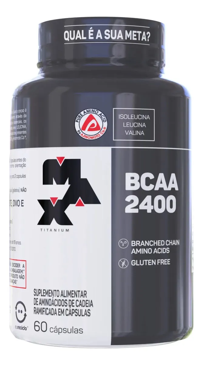 BCAA 2400 Max Titanium 60 cápsulas. Aminoácidos de cadeia ramificada 2:1:1. Reduz catabolismo, estimula síntese proteica e acelera a recuperação pós-exercício.