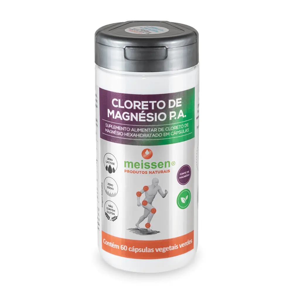 Cloreto de Magnésio P.A. Meissen 60 cápsulas. Magnésio puro para relaxamento muscular, qualidade do sono e saúde óssea e cardiovascular. O magnésio é o mineral com maior índice de deficiência na população.