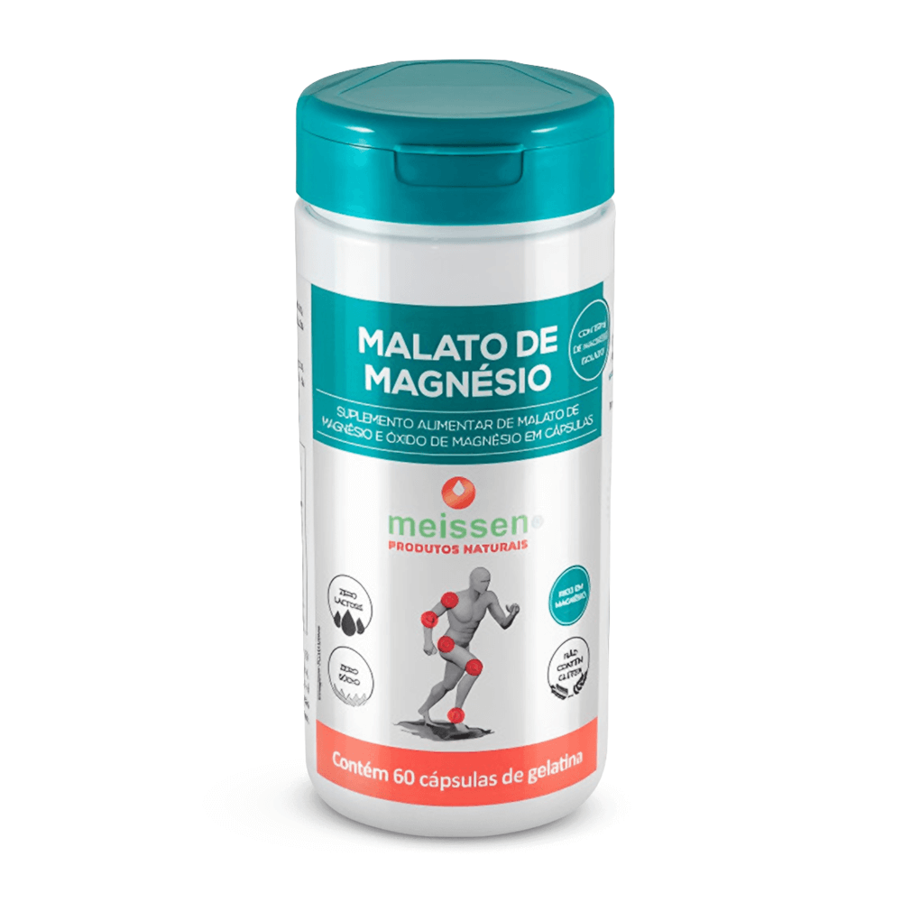 Malato de Magnésio Meissen 60 cápsulas. Magnésio ligado ao ácido málico para melhor absorção. Indicado para fibromialgia, fadiga crônica, dores musculares e aumento da energia mitocondrial.